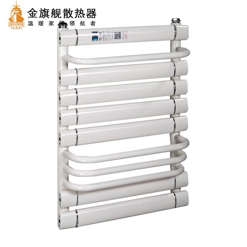 金旗舰卫浴暖气片简约、时尚、美观、大方,既可以取暖,又可以作为毛巾架使用,是卫生间必备产品;其容水量大,水流量大;全辐射散热,比对流暖气片对水温要求低,反应灵敏,一旦启动,立即加热您的皮肤和空气;停暖后,仍能持续供暖,直至水温降至室温水平。